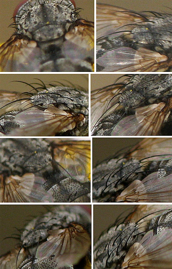 Here come all the other pics I have that might enlighten the case, good and less good, and though they are many, the region below the scutellum is still obscure. If the grey part is a membrane, it is more or less perpendicular if the fly bows down, and gets folded if it straightens. In folded state, it would look like a somewhat bulging but not protruding subscutellum. In any case there is some space between scutellum and abdomen. You have the trained eyes - make the best of the stuff... I wished we could ask Theo, too! Regards, Sundew Sundew attached the following image: ![]() [150.95Kb] |