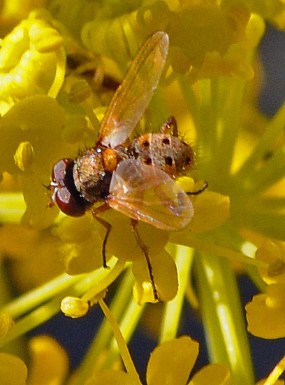 This fly was really small, I shot it by accident while I was focusing on something else. Aprox. 4-6 mm. It has been ID as possible Pandelleia sexmaculata by Paqui Mars in Insectarium Virtual. I would like to know if it could be confirmed. Shot in Sierra Nevada, 2000 masl feeding on Thapsia sp. flowers by humid mountain grassland. 29-June_2008. Granada, S Spain. |