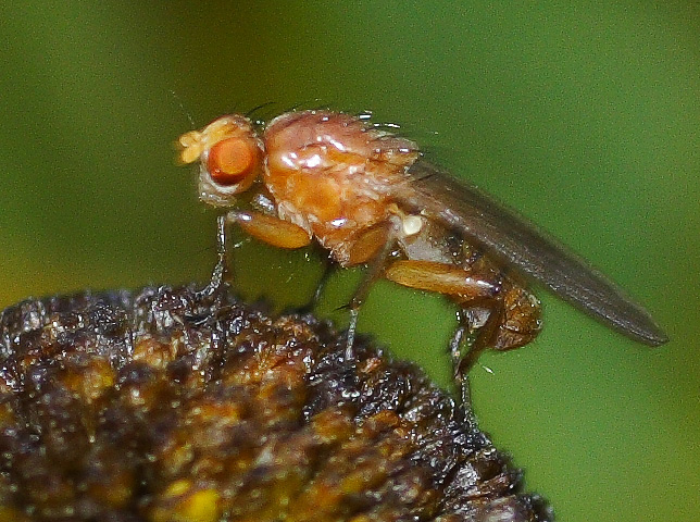 Suillia sp. Heleomyzidae. Neuroctena anilis has not so much setae on thorax dorsum.