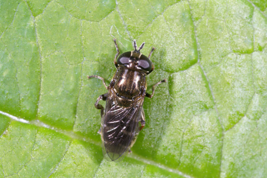 Dit is een Eumerus sp (Syrphidae). Een vrouwtje uit de 'strigatus'-groep en daarom niet op naam te brengen. |