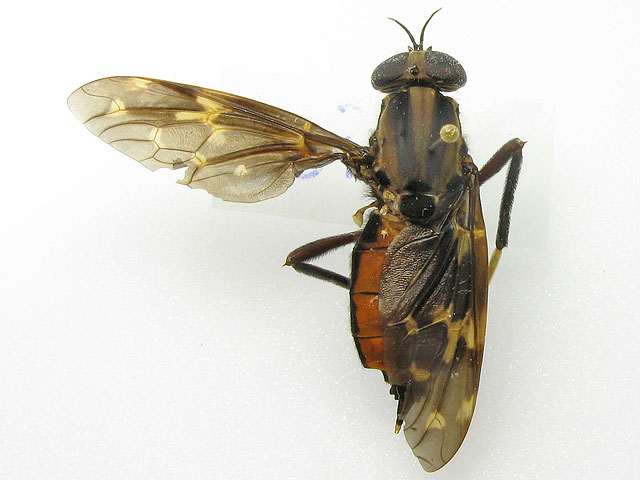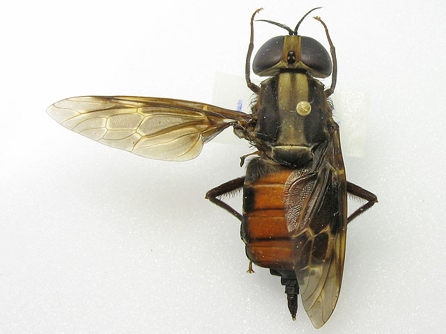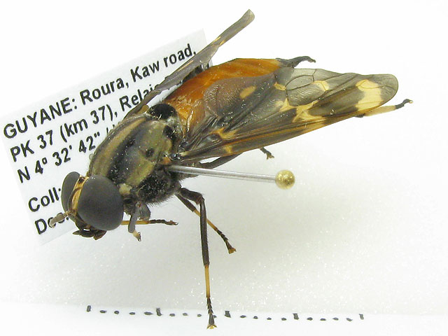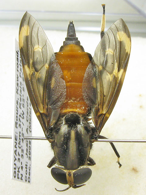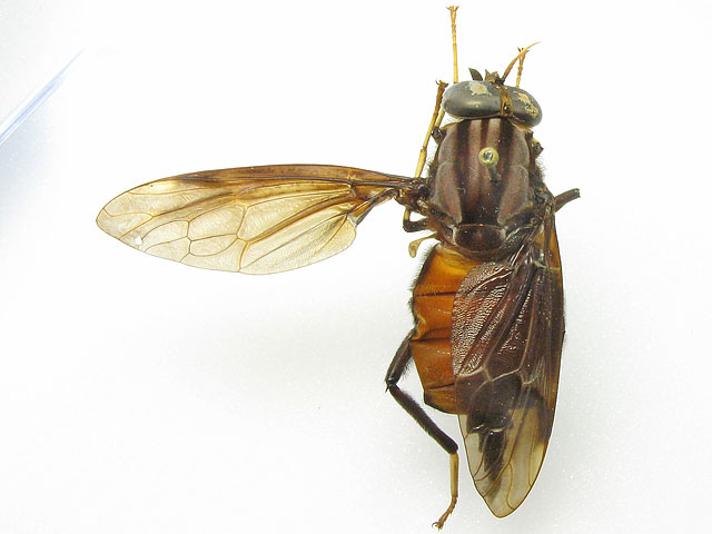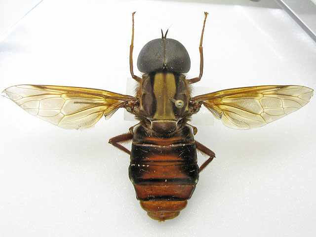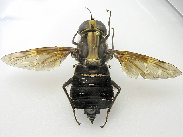 Just for fun and in no particular expectation of an identification, here are some photos of my pantophthalmids (try saying that after a few beers! )All were collected in French Guiana; the first is a male and the rest are females. Pantophthalmids are extremely large flies - the size of these specimens ranges in body length from 36mm to the "smallest" at 25mm and I think my specimens are certainly not considered "large" for pantos. The family is related to the Stratiomyidae but panto larvae bore into live wood. ![]() The small white flecks on the abdomen are phoretic mites - something pantos seem particularly prone to. There are a few more photos on my blog . ChrisR attached the following image: ![]() [53.19Kb] Edited by ChrisR on 11-05-2009 22:56 Manager of the UK Species Inventory in the Angela Marmont Centre for UK Biodiversity at the Natural History Museum, London. |