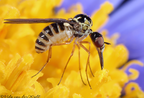 I think this is maybe Mythicomyiidae . Can someone verify please? I took this photo in South Africa where I live. I am not an entomologist but have an interest in insects and love to photograph them. This little fly is very small. Probably between 2 and 3mm. It loves feeding on Feliciaflowers. For some or other reason the tongue or proboscis is never retracted and always extended?