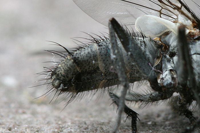 I have been looking for its ovipositor, but I can't find it, certainly not something as conspicuous as on this photo ( http://diptera.info/forum/viewthread.php?forum_id=5&thread_id=5141 ), as you can see on the photo I've attached. So I thought I had done something wrong. I checked the characteristics you've mentioned again: it centainly has has whitish hairs on the lower part of the back of its head (silverish isn't a good description, though, on second inspection they look even a bit yellowish) and the pulvilli seem small to me, but perhaps I've judged that wrongly. Could it be a male? Menko Vlaardingerbroek attached the following image: ![]() [157.73Kb] Kind regards Menko Vlaardingerbroek |