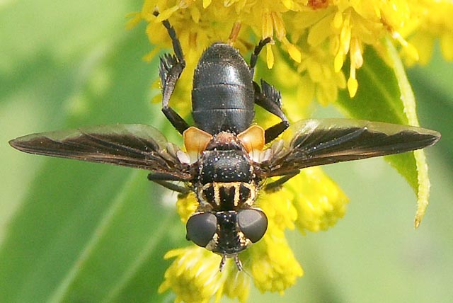 WOW! This is Trichopoda pennipes - TACHINIDAE. It parasites the hemipteran Nezara viridula. I only saw this beauty once. |