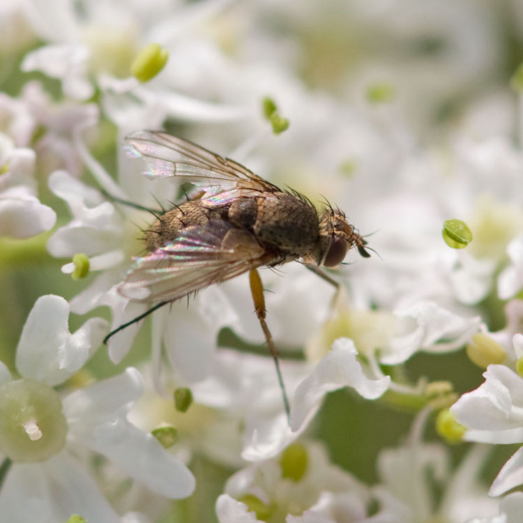 French Jura, Mesnois, 22 July. Small fly, compare with Hogweed flower (3 - 4mm or so). Between meadows, forest nearby.