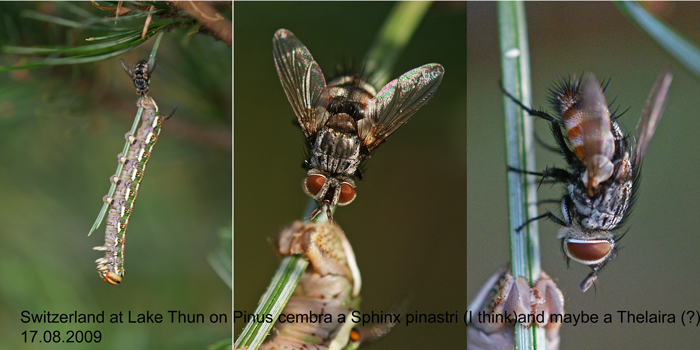Hi, Nice action photos. The larva is indeed Sphinx pinastri. The fly is more difficult, however... hairy eyes, narrow peristome and overall appearance give some ideas. First impression was Carcelia, but host doesn't match. I would put this in Winthemini, perhaps Winthemia cf. cruentata. A lateral shot with more details (eg. the last image zoomed bigger), should confirm this. Jaakko |