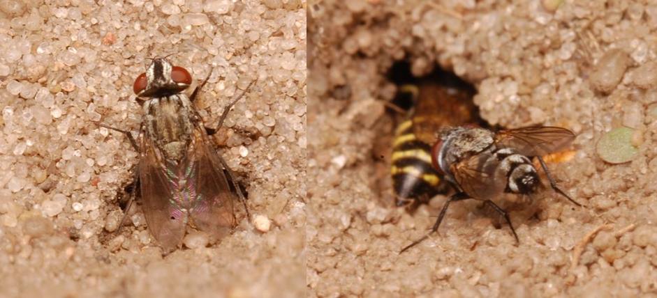 my pictures illustrate two probable tacticts of oviposituion (larviposition) of this fly. First, putting its abdomen into the hole, second , inspecting the hole (here by chance in the presence of the wasp that made the fly to withdraw ) ..just impressions from my short visit
