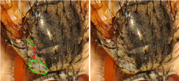 Thanks Theo, so you don't use the parafaciala ? We've seen those females independently. I took the picture of this female the 20 november and Eric the 30 november. It was at the same place, but not the same day. I think I've taken others pictures of females Macquartia the month before, but I must have a look in my pictures to be sure. Am I right with the annotation of this picture showing the pre-alar bristle shorter than the distance between its base and the posteroir edge of the humeral callus. Christine Devillers attached the following image: ![]() [104.01Kb] Edited by Christine Devillers on 07-12-2009 21:44 |