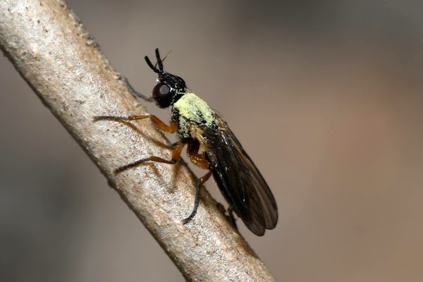 The thorax is covered with pollen. What throws me off is the combination of relatively short antennae in relation to the head, the completely yellow legs, and the seemingly dark body. THe length was about 7-8 mm. When making the photo I thought this was a Tachinid.