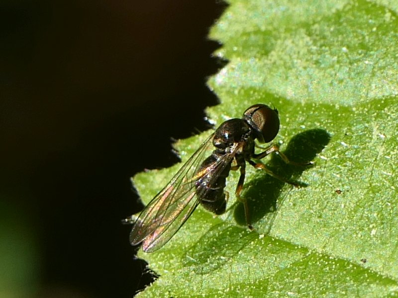 a ~4 mm fly with large eyes, hovering at a hedge (northwest Germany).