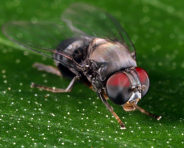 it is a way to express the beauty of this fly and specially the bicolour of the eyes. Also I love so much those very small microtrichia (very small "hairs" ) acrostichal (zone between the middle and the periphery of the thorax...). The fly itself resembles like a robot fly.. the greyish metallic colour and the position it has in relation to the leaf.your ccd needs a clean. this is the big disadvantage in dslr!