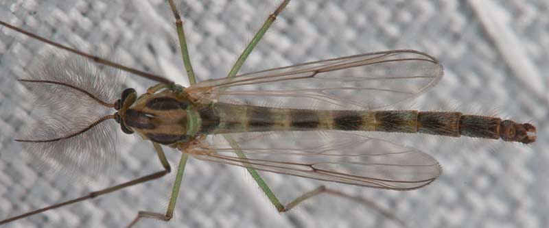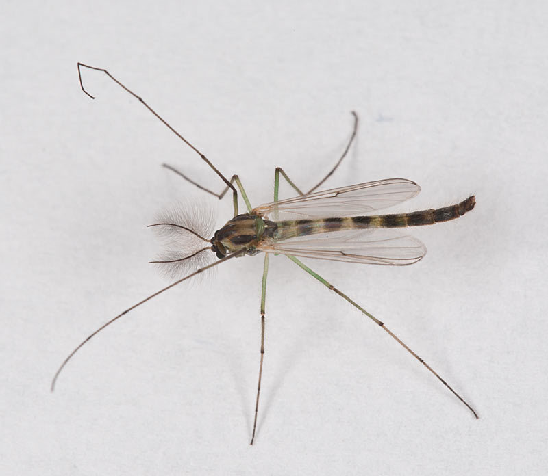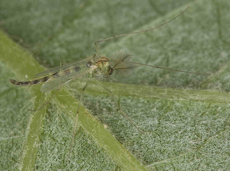 C. plumosus is much larger than 7 mm and has a long beard on the fore tarsi. This superficially resembles the American C. decorus group, which is typically near 6 mm long, with banded abdomen, and with all wing veins brown. |