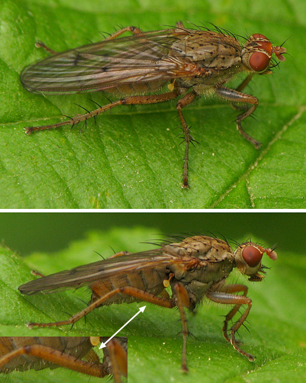Hi, Recently I met this Scathophaga - I know ID is difficult. However, it is no S. stercoraria, as the antennae are yellow and the arista seems to be bare. Furthermore, there are anterodorsal bristles on the hind femur (as far as I understand the bristle terminology). So are there any experts that could supply a possible name? Many thanks, Sundew Sundew attached the following image: ![]() [175.77Kb] |