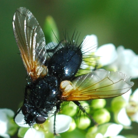 Definitely Zophomyia temula - nothing else is so shiny-black with bright orange wing bases ... except Mesembrina meridiana, which is a larger, fatter muscid ![]() Saw a lot of these on a local nature reserve yesterday - all flying in and out of the low grass and flowers