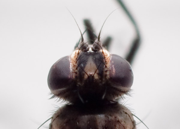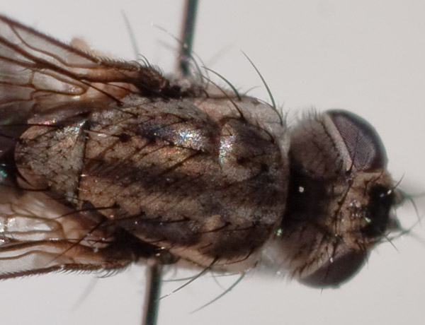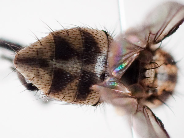 c5mm, Lancashire England 12 June 2010. For this one I think L. riparia, but with doubts about triangula. The pre-acs are in two rows, but the frontal triangle seems brown rather than 'whitish dusted'. The arista has short hairs fairly regularly spaced, so probably a bit more than 'pubescent'. The abdominal spots look more triangular than trapezoidal. Do the photos tell anything? Stephen. Stephen R attached the following image: ![]() [63.23Kb] |