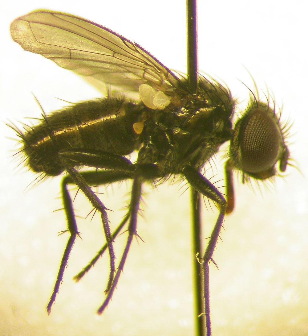 Rhinophora lepida? That species is small with yellow halteres ... and very common at this time of year
