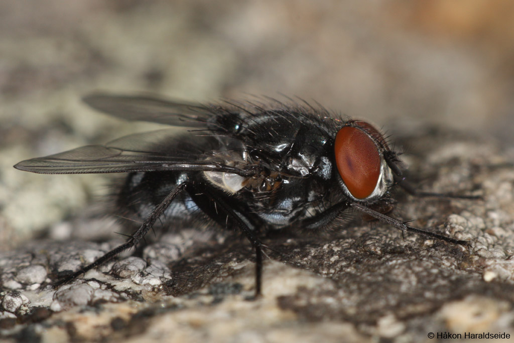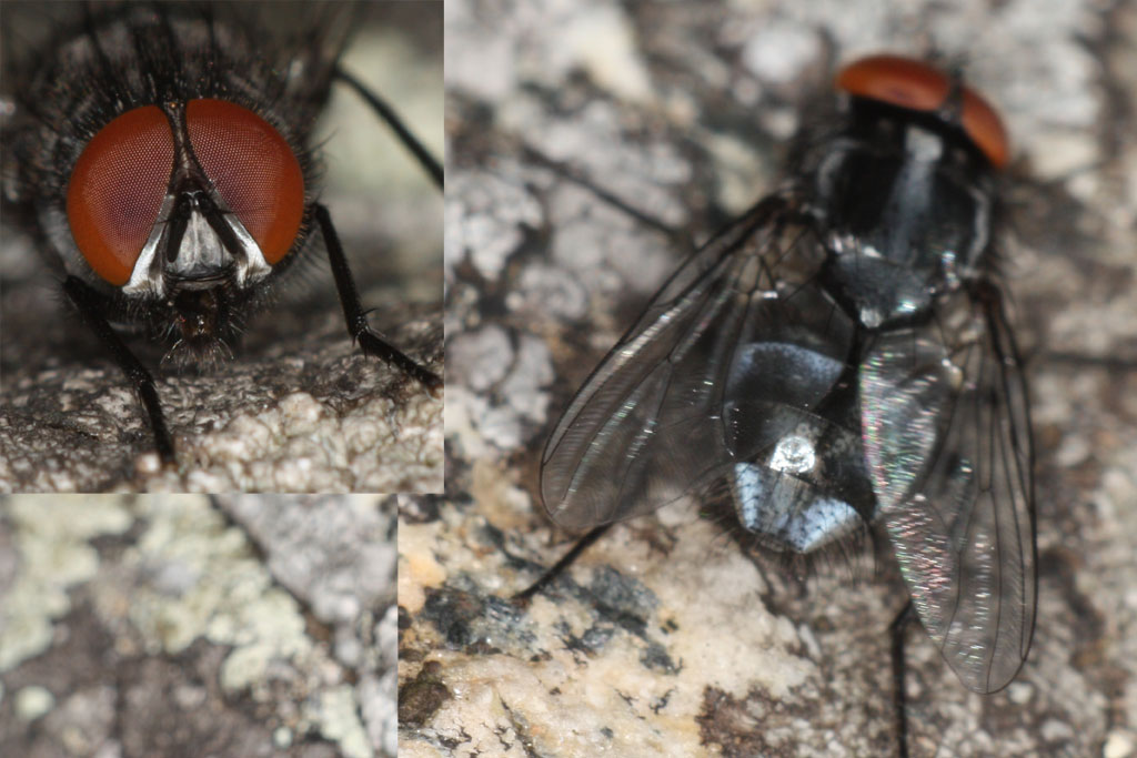 A fly wich looks like a Morellia but with the vein M straight and the eyes hairy : Polietes domitor.