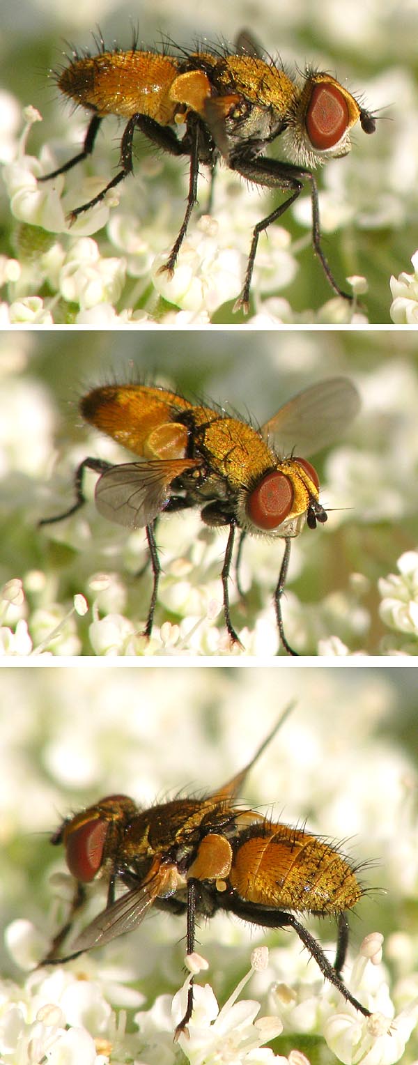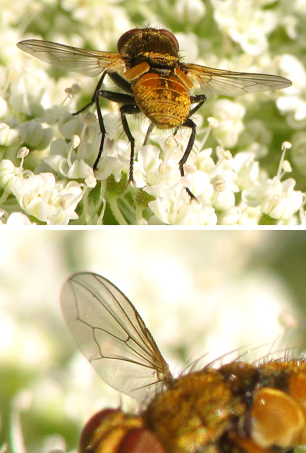 Hi, Some days ago I saw this small yellow Tachinid on an inflorescence of wild carrot. I think the 3rd antenna segment is not long enough for Eliozeta, so it might be Clytiomyia. The Clytiomyia continua I photographed two years ago was, however, much less golden as to face and thorax (but not as dark as the photos in the gallery). Is the colour so variable? Many thanks for help, Sundew Sundew attached the following image: ![]() [129.4Kb] |