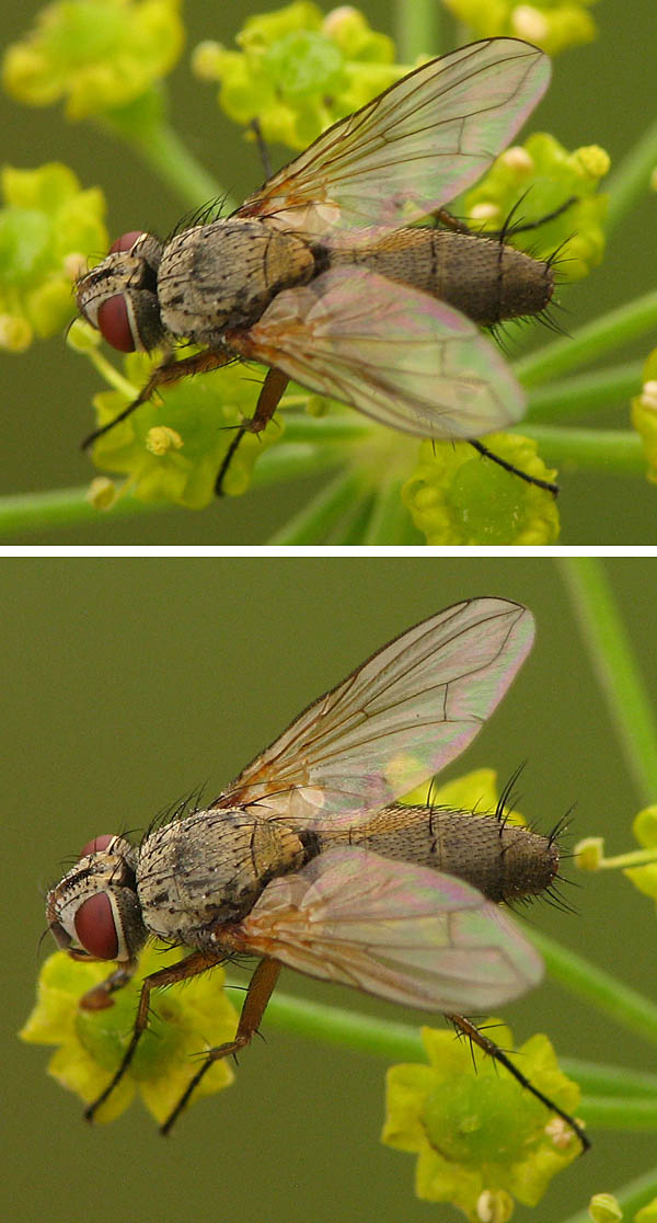 I have been confused by Dinera grisescens in the past - they are both the same size and have grey/brown dusting and have 2 pairs of scutellar bristles. But Dinera has a plumose arista, while in Solieria they are bare