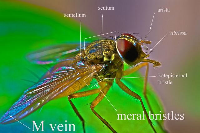 The hypopleural bristles are well visible, that rules Muscoidea out.