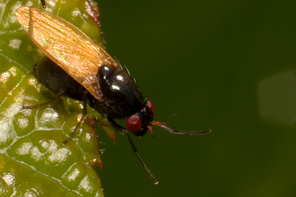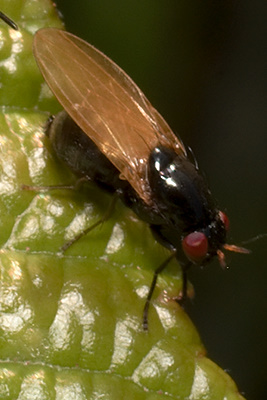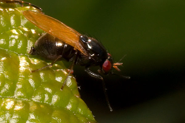 Shiny black with orange and red > Calliopum, Lauxaniidae