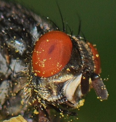 I am not sure this is Ravinia pernix, and I am basing this partly on the colour, which is too bluish-black as compared to the more greyish colour of R. pernix, and partly on the rows of frontal bristles, which I interpret as diverging abruptly anteriorly [difficult to see, though]. I would think this is a female Sarcophaga sp., and if very hardly pressed for a species name I would put my bets on Sarcophaga caerulescens, which is the species of British Sarcophagas, that in general is most dark and has that bluish 'whif' that also has given rise to its name. |