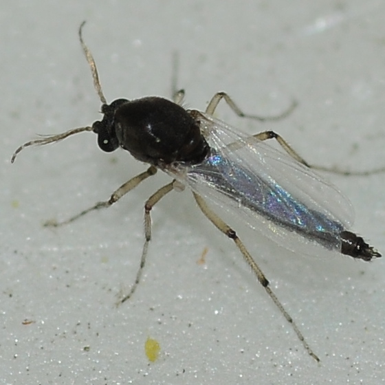 My best ID is male of Ceratopogoninae (the R cell is too long for the other subfamilies). Next to still, shallow water; flowing water is also within plausible flying distance. Size 2.5mm.