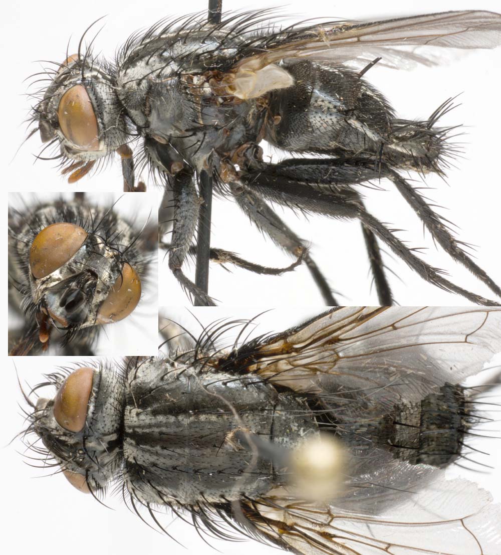 Here is an other one that makes me wonder if it's a Tachihidae after all. Large Sarcophaga-size fly but the smaller two notopleural bristles and small hairs on hind coxa are missing. Arista is plumose and it won't fit to the Sarcophaga key. July 16. 2010 Loviisa, Finland. Jari JariF attached the following image: ![]() [170.8Kb] Edited by JariF on 13-12-2010 15:37 |