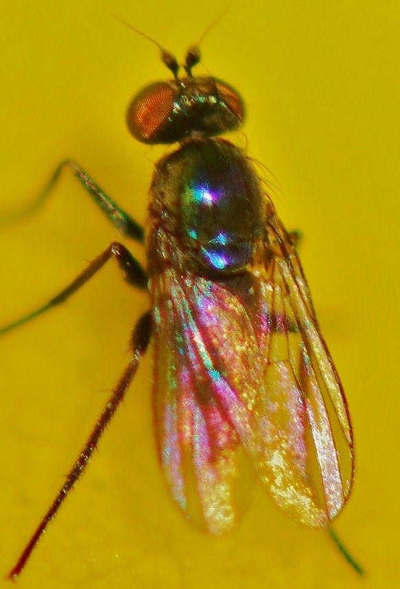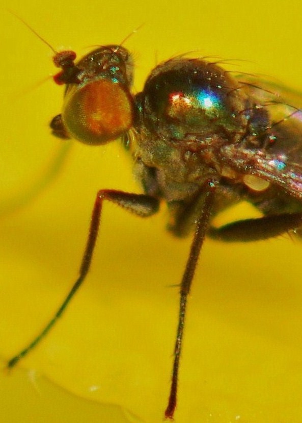 Hello! This I had marked as 3mm, but to my memory it seems smaller, more like 2mm! It was impossible to get good pics of as it kept moving, but hopefully there's enough for at least a genus. The colour to my eye was deep metallic blue, but shows differently in the pics. I imagine it's another Chrysotus sp. 16th June 2010. my garden near Lincoln UK. Janet