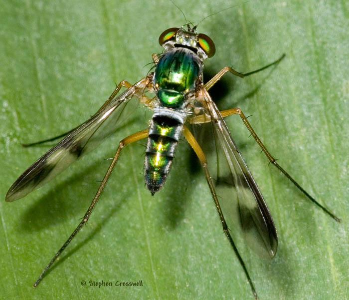 Dear Stephen, Sciapodinae is certainly one of the most speciose dolichopodid subfamilies in the Neotropics, but does not reach the staggering diversity found in Diaphorinae. It is true, however, that they are most noticed, wandering around on leaves at eye height ... Another subfamily, Achalcinae, is almost never observed in the field, but is collected, sometimes in numbers, in yellow pan traps. If you want more diversity (anything better than Condylostylus, cfr. Chardonnay), just humid and muddy places (e.g. river banks, springs, waterfalls, ...). You'll be amazed. Cheers, Marc |