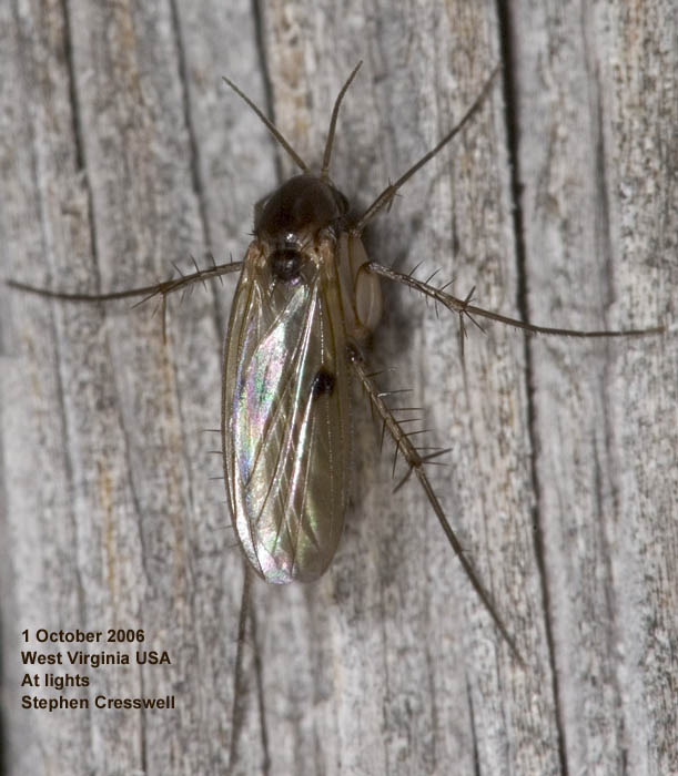 1 October 2006, at the mercury vapor light, West Virginia USA. Surrounding forest and meadow. 4.2 mm to wing apex. Mycetophilinae? Stephen attached the following image: ![]() [89.85Kb] --Stephen Stephen Cresswell www.americaninsects.net |