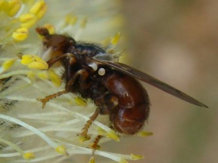 This Myopa dived somewhat too deep in the flowering Salix caprea and may show too little of the wing pattern. It was seen on 10 april in the Netherlands at the border of a beach forest and ex agricultural area [returned to nature] now heath-grassland, grazed area. Can someone help to tell the species