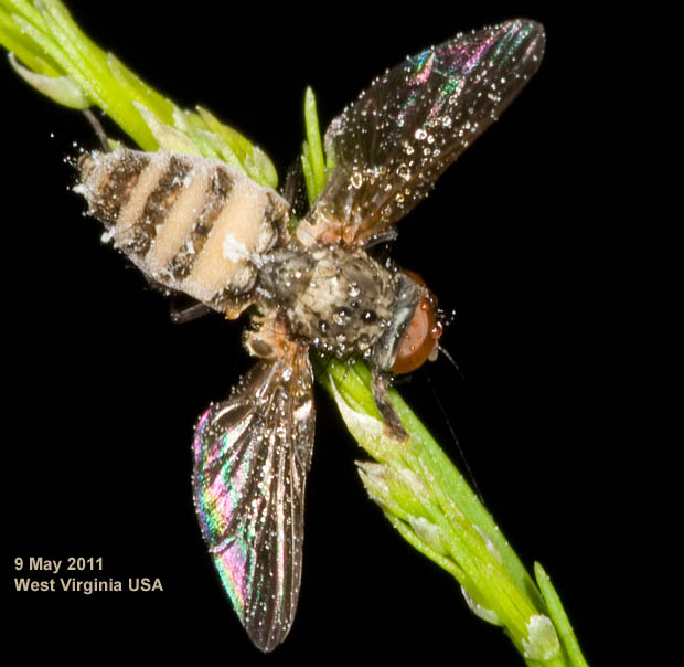 Anyone recognize this unfortunate fly? Several of these small flys were on a single asparagus plant. They were motionless even when touched and I assumed they were dead. Victims of a fungus, perhaps? The photo was taken in the morning and I believe those are drops of morning dew on the fly. West Virginia garden, USA, on asparagus, 9 May 2011. Stephen attached the following image: ![]() [79.2Kb] Edited by Stephen on 17-05-2011 11:26 --Stephen Stephen Cresswell www.americaninsects.net |