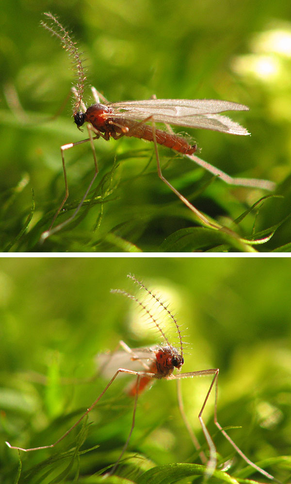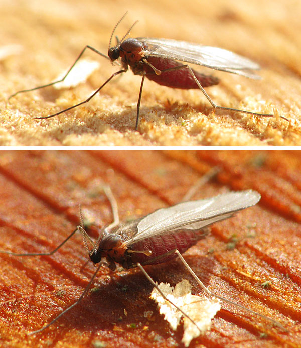 Hi, When I was on Rugia Island in March, I saw a lot of reddish Cecidomyiids in the woods. As beech is very frequent there, I assume that the midges could be associated with that tree. Thus it might be Hartigiola annulipes or Mikiola fagi. Is there anyone who can tell apart the imagines of these taxa? Many thanks, Sundew This ist the male: Sundew attached the following image: ![]() [119.3Kb] Edited by Sundew on 23-05-2011 19:05 |