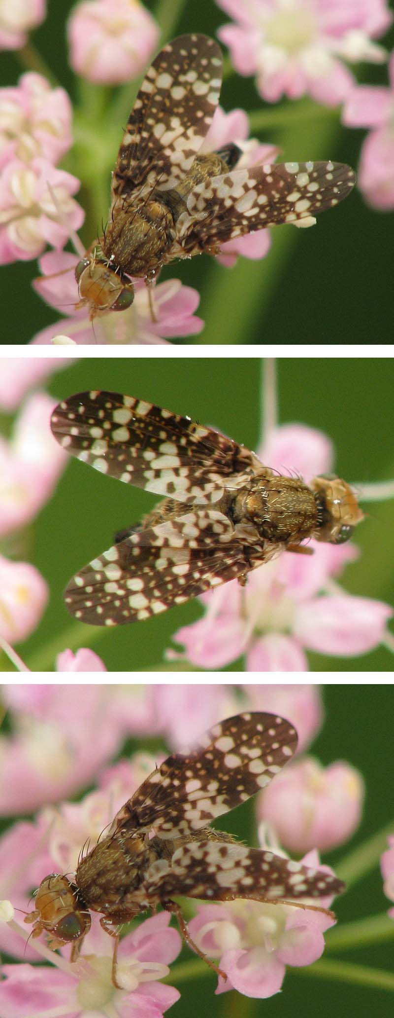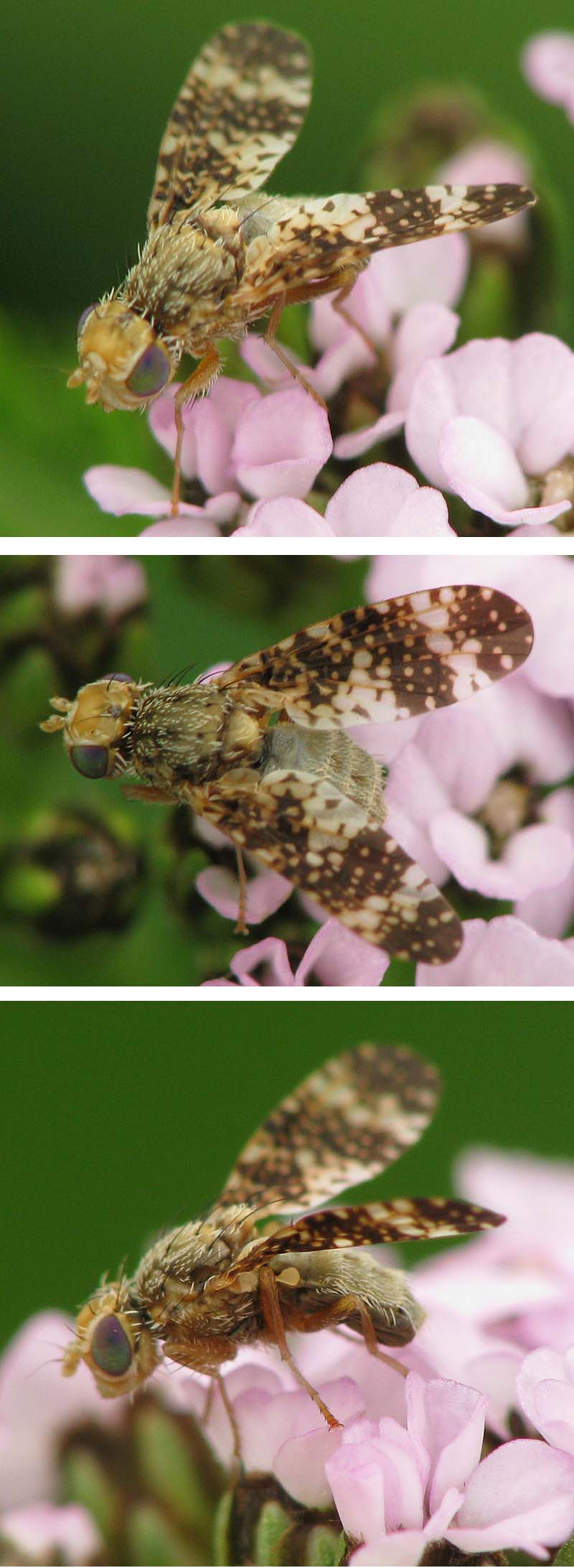 Hi, Here comes a Tephritid species frequent in Niederthai (Austria, Tyrol, 1.500 m) in August. I met it often last year, and I think all three animals depicted - a female, a male and another female carrying a mite nymph - belong to the same species. Wing pattern recalls Campiglossa, but that is just a guess of mine. ID help is appreciated! Many thanks, Sundew Female 1: Sundew attached the following image: ![]() [131.7Kb] |