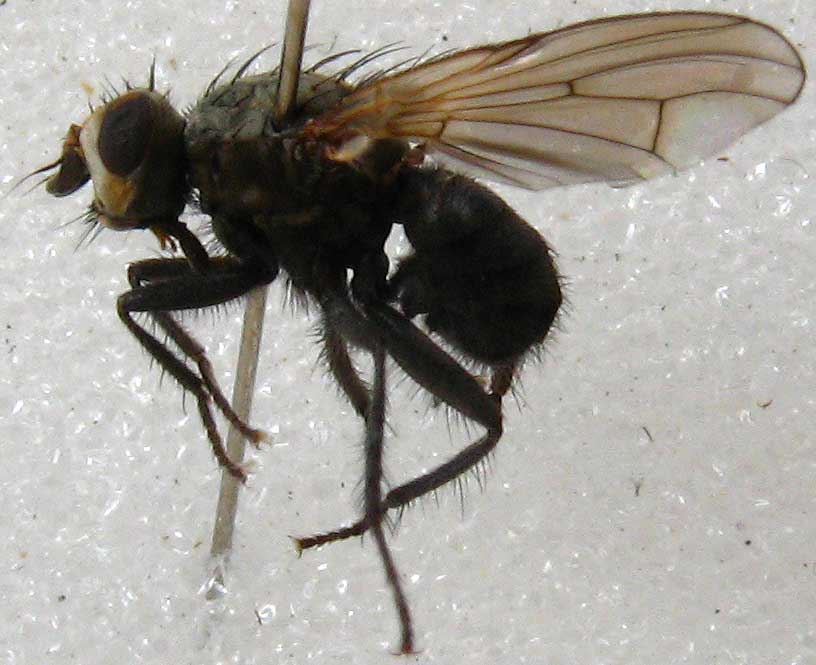 This fly is very distinctive with its fat abdomen. About 5mm length, swept from riverside, 14 July. It has no post verticals (that is verticals directly behind the ocellar). It has a pair of crossed innner frontals just in front of the ocelli (if inner frontals is what these bristles would be?) I can't even decide for sure if it is acalypterate!! Keying it, I reach Piophilidae, which does not seem right. What family is this fly? conopid attached the following image: ![]() [50.65Kb] Nigel Jones, Shrewsbury, United Kingdom |