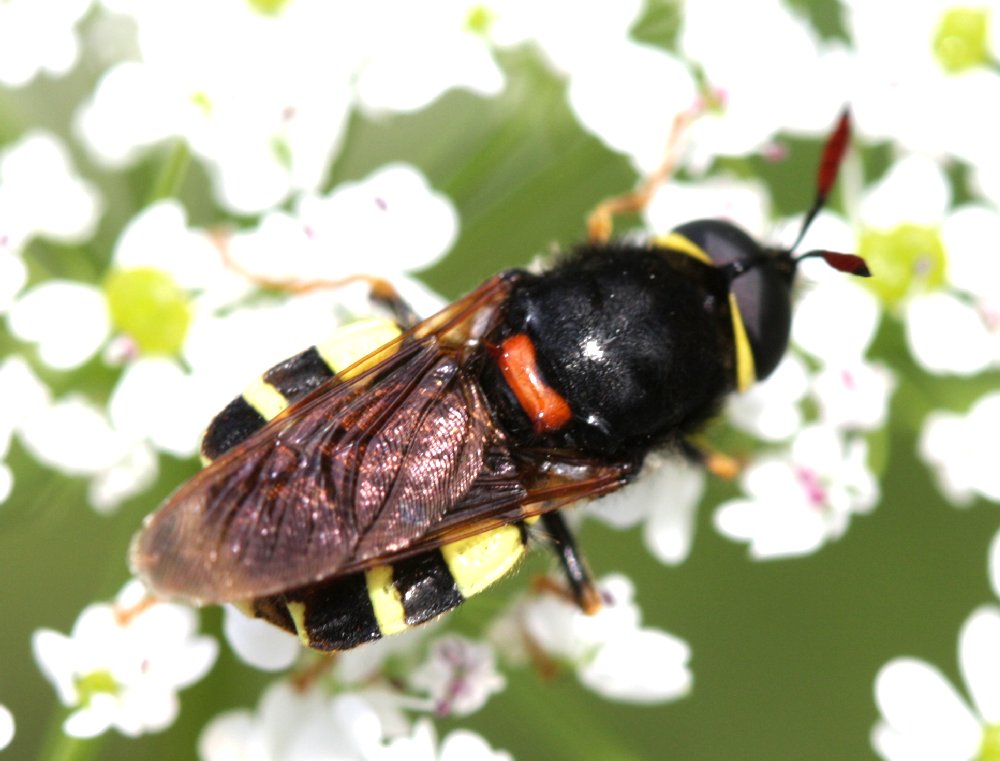 the description refers to a female, the fly is a male (holoptic eyes).. description of the male should remark: yellow halteres; orange scutellum; tibiae not totally black; scutum totally black; third antennal segment reddish; abdomen is not black as it is described for the female (and it seems to have no median band..). Nevertheless a very nice Stratiomys. To me it's a Stratiomys noidea. Martin Hauser surely knows this one. Edited by jorgemotalmeida on 26-07-2011 19:41 |