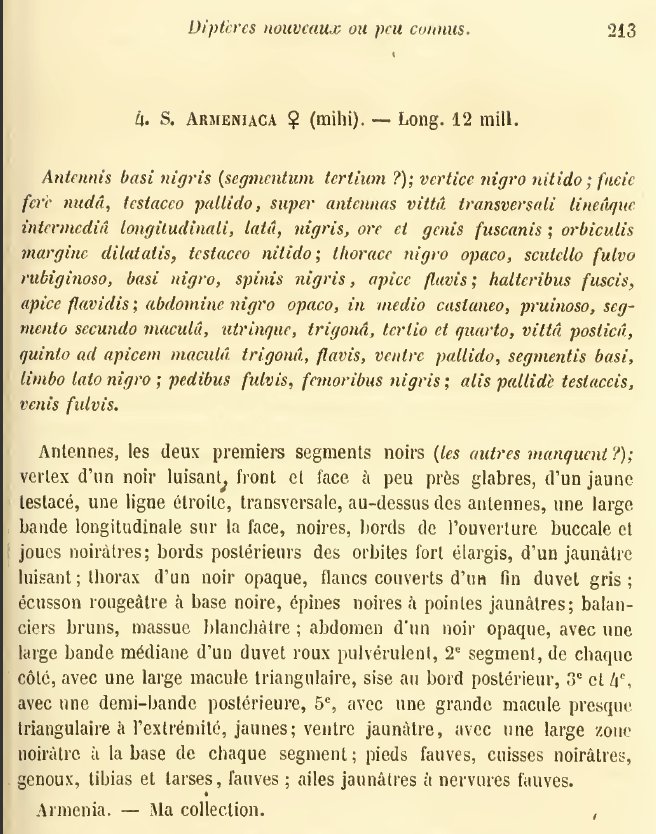 Bigot, J. M. F. 1879. Dipteres nouveaux ou peu connus. 11e partie. XVI: Curiae Xylophagidarum et Stratiomydarum (Bigot). Ann. Soc. Ent. Fr. ser. 5, 9: 183-208 [1879.08.27], 209-234 [1879.11.12]. The description of the male maybe can appear in this document.. I do not have it. |