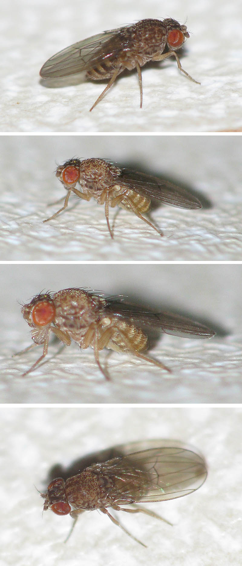 Hi, This Drosophila recently appeared in my kitchen, obviously interested in rotten potatoes. I am sorry I have no better lateral view of the tergite markings. Can a species name be given? Many thanks, Sundew Sundew attached the following image: ![]() [135.26Kb] |