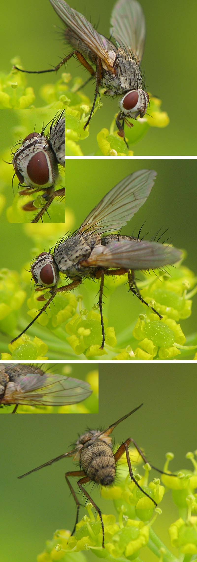 Hello, This is a Tachinid from Rudolstadt, Thuringia, seen in July. First I thought it was a common Dinera grisescens, but after a closer look at the photos I had my doubts about that ID. I cannot see a plumose arista, which is clearly recognizable in my other pictures of Dinera grisescens, and the scutellum tip is yellow. Also the colour of the proboscis differs. So I wonder who this fly may be - another Dinera species ore something else? Many thanks for help, Sundew Sundew attached the following image: ![]() [144.34Kb] Edited by Sundew on 18-09-2011 21:12 |