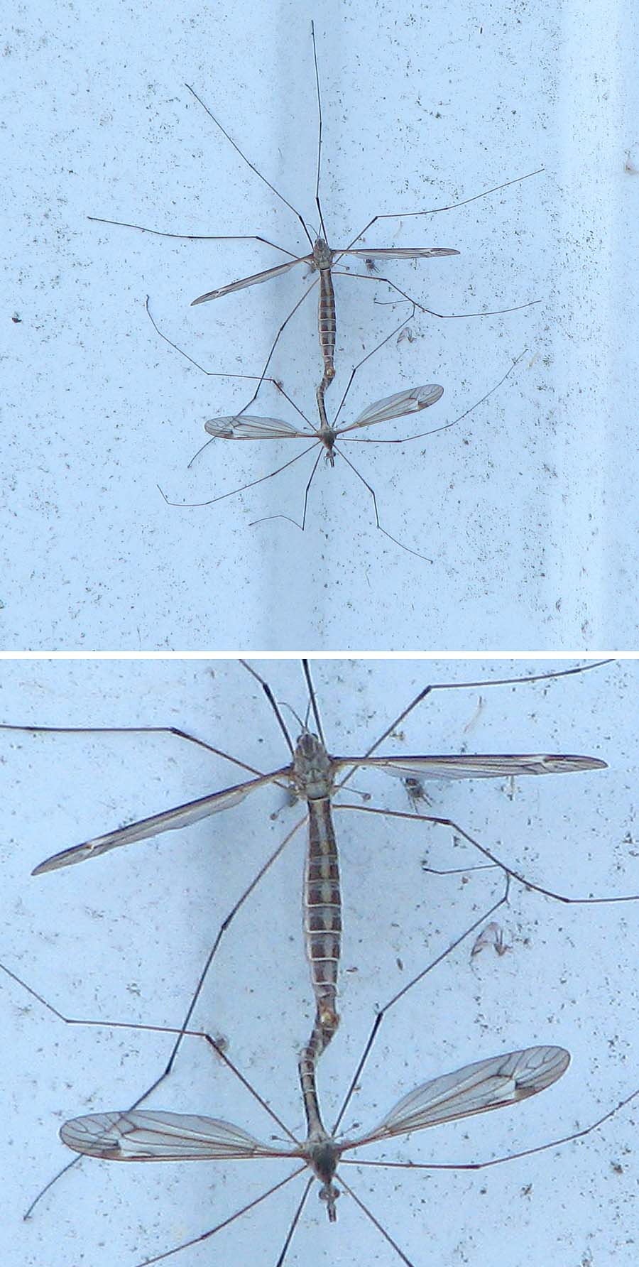 Hello, This Tipulid couple sat on a house wall, and I had to use the zoom, as I could not get closer. Therefore we cannot see much details, only the abdominal patterning. Probably it's Tipula, can a subgenus be added? Many thanks, Sundew Sundew attached the following image: ![]() [156.45Kb] |