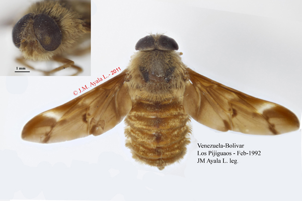 Hi Jose M, Yes, I think this is a nemestrinid, Atriadops macula (Wied.) -- the only known member of this genus in the new world (Woodley, 2010: MCAD 1, pg. 559). Other Atriadops are found in the old world. Would you please provide a back-lit photo of a wing, to better show the venation? Thanks, Eric Edited by Eric Fisher on 24-11-2011 18:22 |