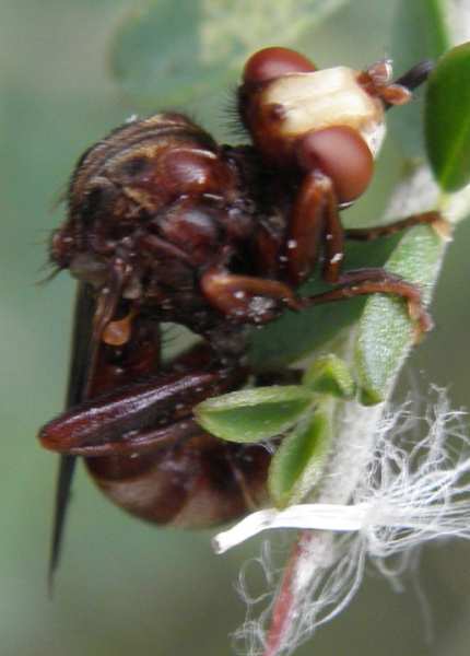 Sicus are hard to identify. I only know about the key Stuke 2002, which uses only the theca. Thus only females can be identified. You will have to have photo's of the theca or the specimen collected if you'd want it identified. Mark van Veen site gives a key online: http://home.hccnet.nl/mp.van.veen/conopidae/sicus.html Hope that helps, Ectemnius |