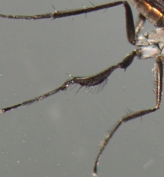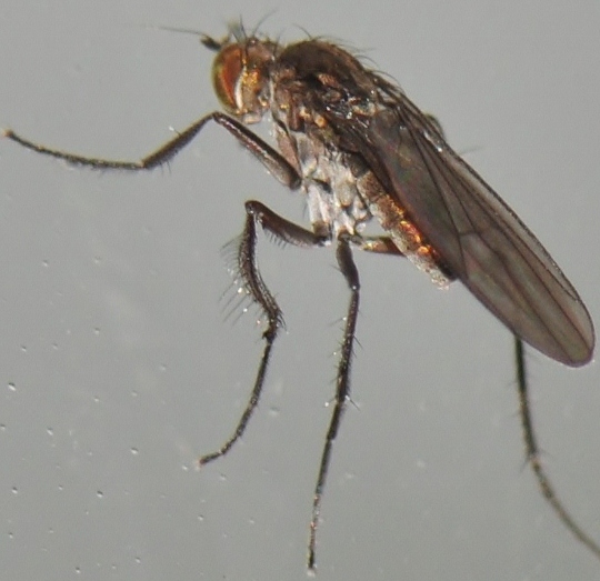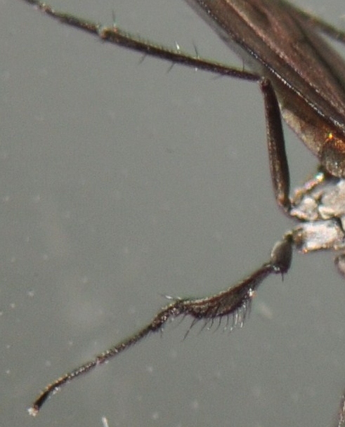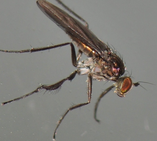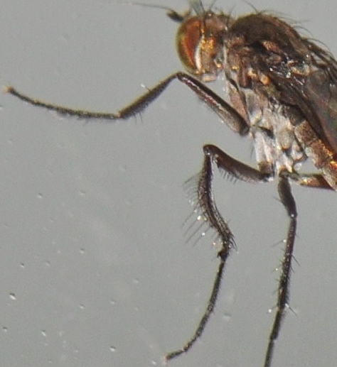 I only kept the best 4 photos Igor! Imagine trying to take photos of a small fly running up and down a window, with me squatted on the kitchen sink trying to takes photos! ![]() It may have been smaller Tony, I don't take into account wings etc. but when you can't see the abdomen well it can make the difference. I have cropped the photo from behind which shows the mid basitarsus best, it looks to me if there was a "distinct and rather long process on apex of mid basitarsus" it would show in this shot. I have also cropped one of the semi-side views which might show the front tarsus better, it looks like it could be "long setose ventrally" in the sections Paul mentions but I don't know how long they should be. blowave attached the following image: ![]() [144.99Kb] http://cubits.org... |
