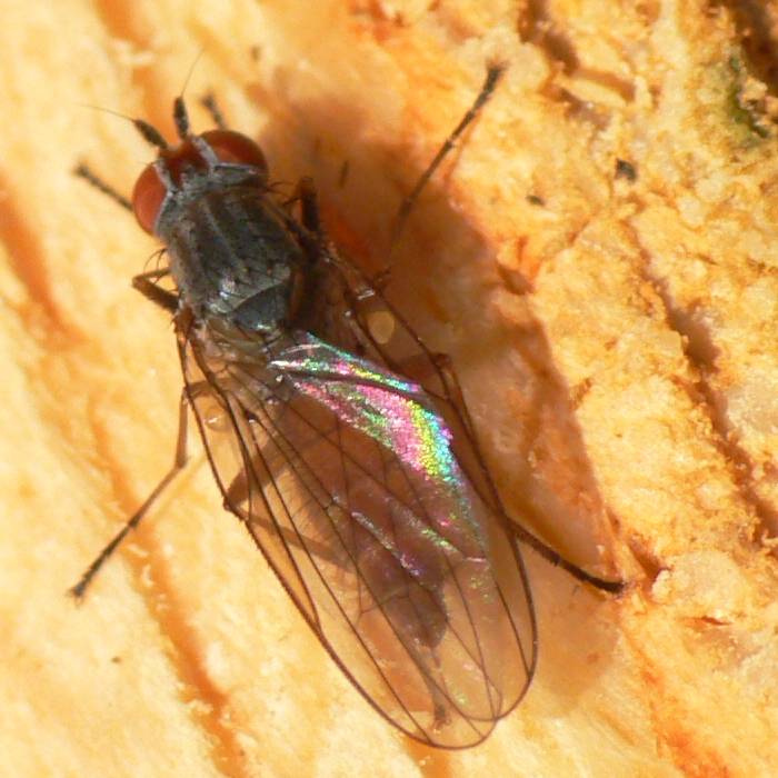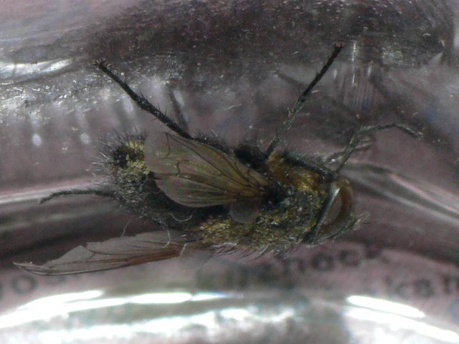 . A scrubby Pollenia male just orbited my desktop lamp...