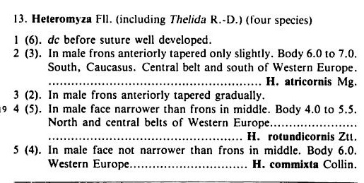 Andrzej wrote: I enclosed a pic from Czerny (1927) ! It is the head of the true male of H. rotundicornis Then it has to be H. rotundicornis Andrzej! I think the drawing has over exaggerated the closeness of the eyes, there are 'grooves' on the face which may have been included in the eyes but really should not have been! I have photos of the same fly from January and early March last year, I posted it but I don't think I got a reply. The only other Heteromyza is H. oculata which has "eyes tapered near ocelli markedly". Is there a possibility the female I had could also be H. rotundicornis? Two shots of the head from last year .. this from 3rd March blowave attached the following image: ![]() [192.47Kb] Edited by blowave on 21-01-2012 14:11 http://cubits.org... |