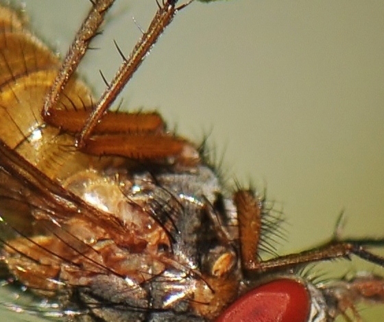 Hi Janet, Yellow abdomen, 3 posteriors on mid tibia, yellow pleura, this is a male Phaonia rufiventris for sure. Niels. |
