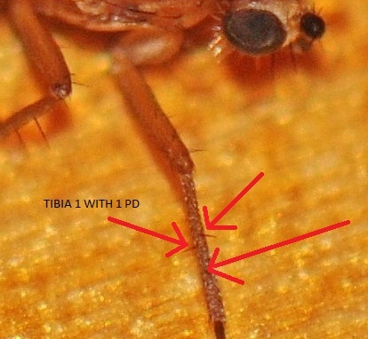 The ventral bristles on the middle tibiae you refer to I believe is one near the distal end, as can be seen in the photo in the gallery belonging to Jorge.
