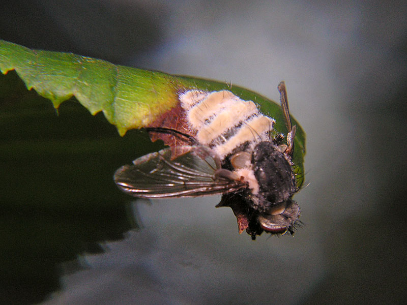 Hi Robert Yes, it's a fungus called Entomophthora or Empusa (probably species muscae). It is common in muscids, scathophagids and syrphids such as Episyrphus balteatus. One of the effects of the fungus is to change the behaviour of the host so that it clings onto a tall grass blade (or other leaf) and sticks its abdomen in the air, so that the spores have the best chance of dispersal. Edited by Tony Irwin on 11-12-2006 22:17 Tony ---------- Tony Irwin |