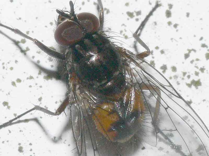 Hello Juergen, I am far from an expert, but I'll give you my thoughts on this one. Two possibilities spring to my mind when I see such an orange-tipped scutellum: Muscina sp. or Phaonia sp. I don't think it is Muscina, because I do not know of any Muscina with such an orange abdomen. That leaves me with Phaonia subventa and the like, but in that case it is probably a species I do not know, because the thorax seems to be too dark for subventa, and the extensive black markings on the abdomen do not seem to fit rufiventris. On top of that, it lacks the infuscated cross veins Phaonia often shows. Which leaves you with very little, I'm afraid ![]() Hopefully one of the experts can help you further. P.s.: is that a Phaonia bristle sticking out under the left wing, just above the hind left leg? (lower picture). http://slamenietd...web-log.nl |